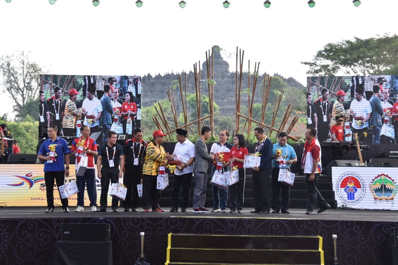 MAGELANG (Jatengdaily.com) – ASEAN Schools Games (ASG) XI, 2019 ditutup, Rabu (24/7/2019) di Candi Borobudur Magelang. Para peserta disuguhkan keindahan Candi Borobudur, pada upacara penutupan yang dipusatkan di pelataran Taman Lumini.
