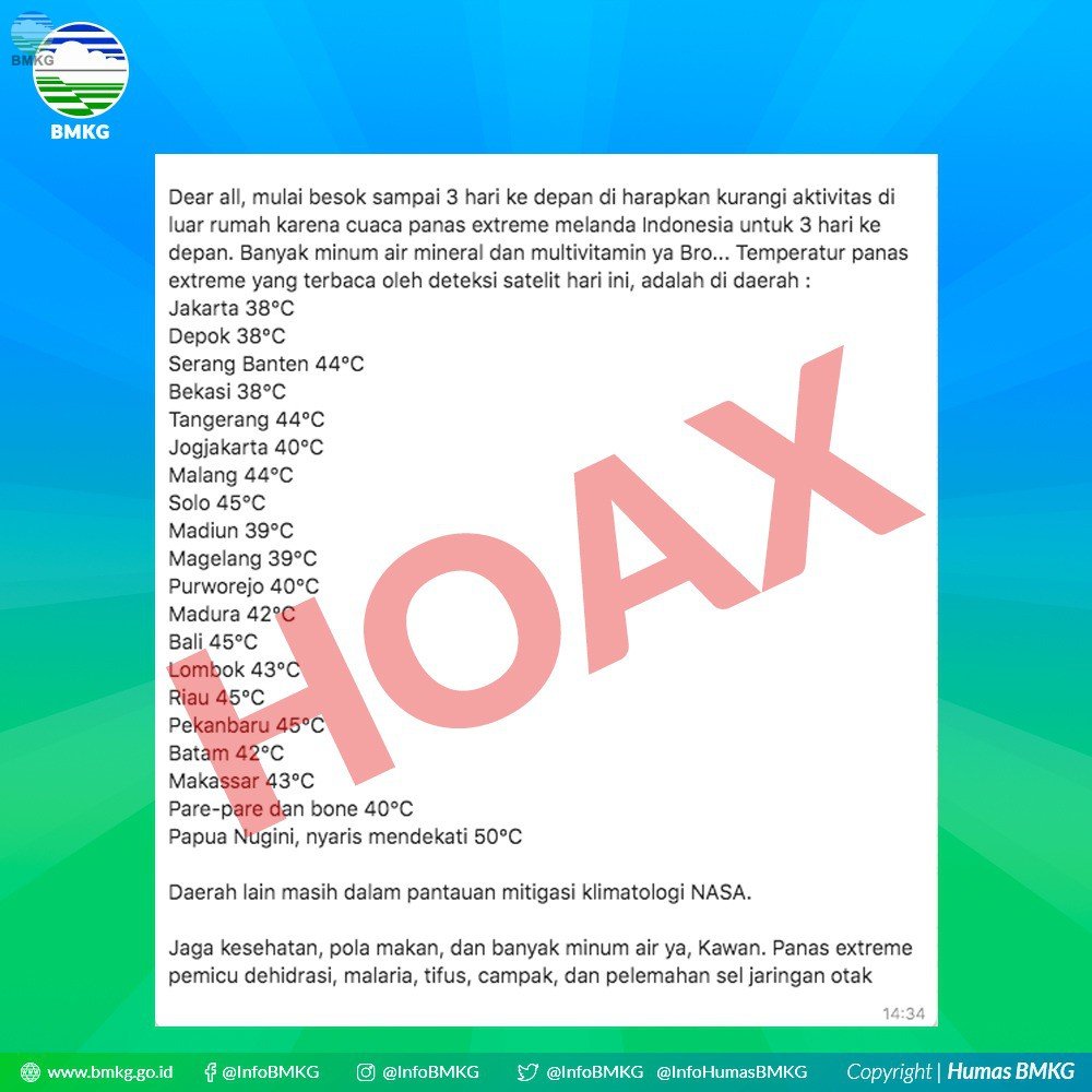 Menurutnya, seperti yang telah disampaikan BMKG, bahwa saat ini Indonesia dilanda suhu Panas, ‘bukan’ gelombang panas. Fenomena gelombang panas tidak terjadi di Indonesia. Berdasarkan data histori, suhu maksimun di Indonesia belum pernah mencapai 40 derajat Celsius.