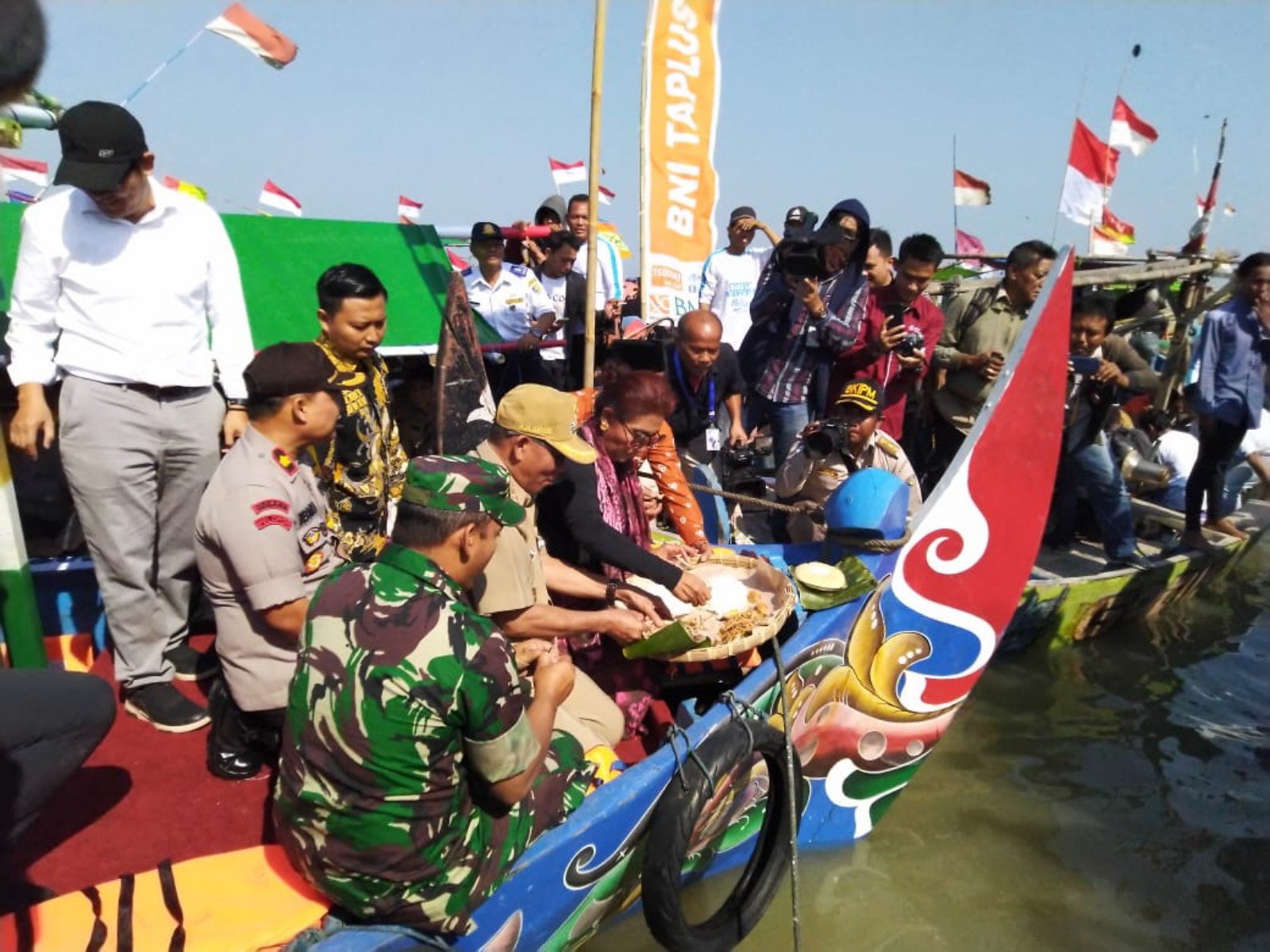 Bersama ribuan nelayan juga keluarga mereka yang ikut serta, menteri berpenampilan santai itu memanjatkan doa syukur atas hasil laut yang melimpah. Utamanya rajungan, yang kemudian menjadi ‘trade mark’ Desa Betahwalang.