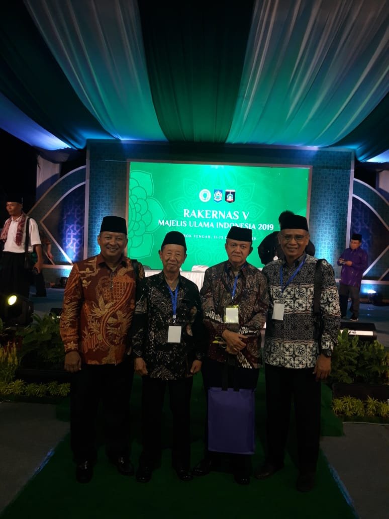 BERSAMA SEKJEN MUI : Ketua Umum MUI Jateng Dr KH Ahmad Darodji MSi, Wakil Ketua Umum Prof Dr H Ahmad Rofiq MA dan Sekretaris Drs KH Muhyiddin MAg foto bersama dengan Sekjen MUI Dr Anwar Abbas di arena Rakernas. Foto:ist