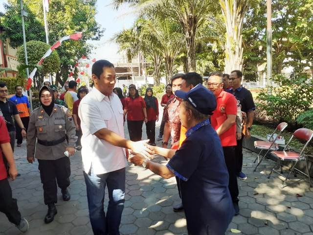 JABAT TANGAN: Walikota Hendrar Prihadi berjabat tangan bersama warga Semarang Tengah sebelum acara penyerahan bantuan dimulai. Foto: Ugl
