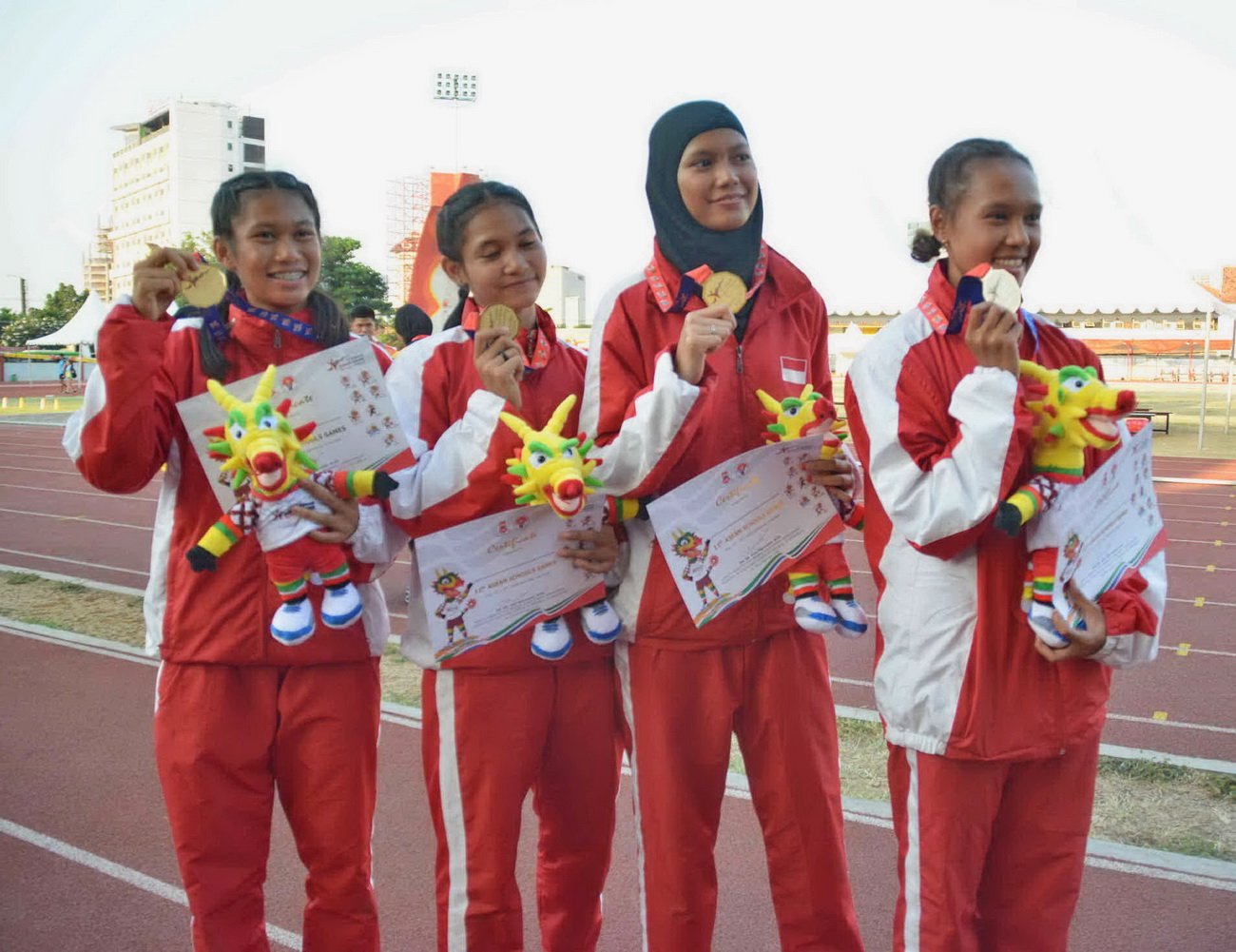Atlet Indonesia saat merebut emas 4 X100 estafet putri. Cabor atletik melampauhi target perolehan medali di ASG 2019. Foto: zia