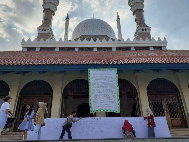 SEMARANG (Jatengdaily.com)- Puluhan pemuda yang tergabung dalam Aliansi Remaja Tiga Masjid mulai membubuhkan tanda tangan petisi di kain mori sepanjang 10 meter di tiga titik masjid (MAJT, MAS dan Baiturrahman), Rabu, (16/7/2019) malam.