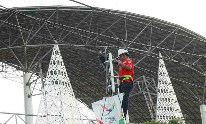 Petugas lapangan TelkomGroup menyiapkan infrastruktur telekomunikasi di salah satu lokasi pertandingan Pekan Olahraga Nasional (PON) XXI Aceh-Sumut 2024 di Banda Aceh pada beberapa waktu lalu.Foto:dok