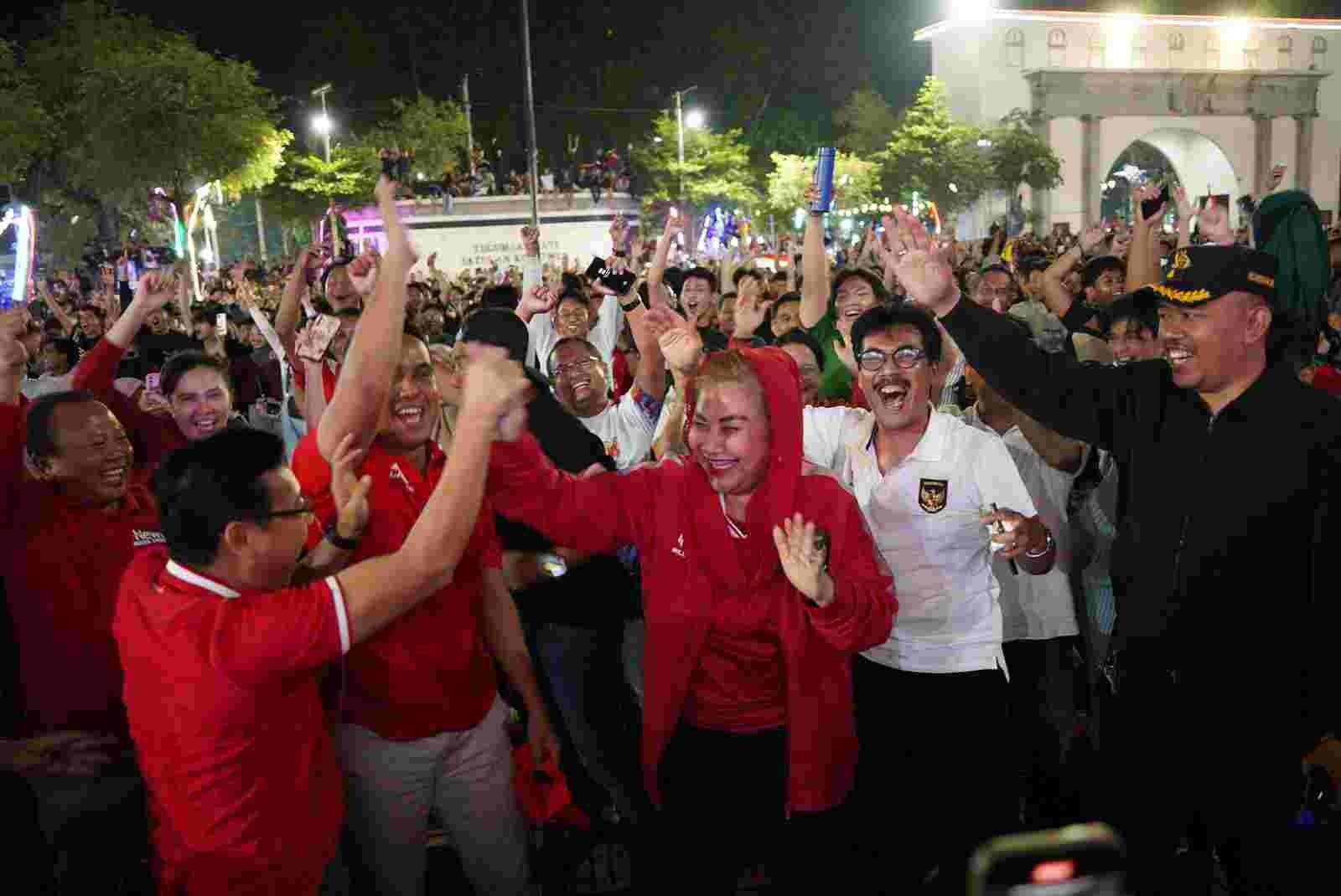 Wali Kota Semarang, Hevearita Gunaryanti Rahayu saat mengikuti kegiatan nonton bareng laga Timnas Indonesia menghadapi Uzbekistan di semi final Piala Asia U-23 di halaman Balai Kota Semarang, Senin (29/4/2024) malam. Foto:dok