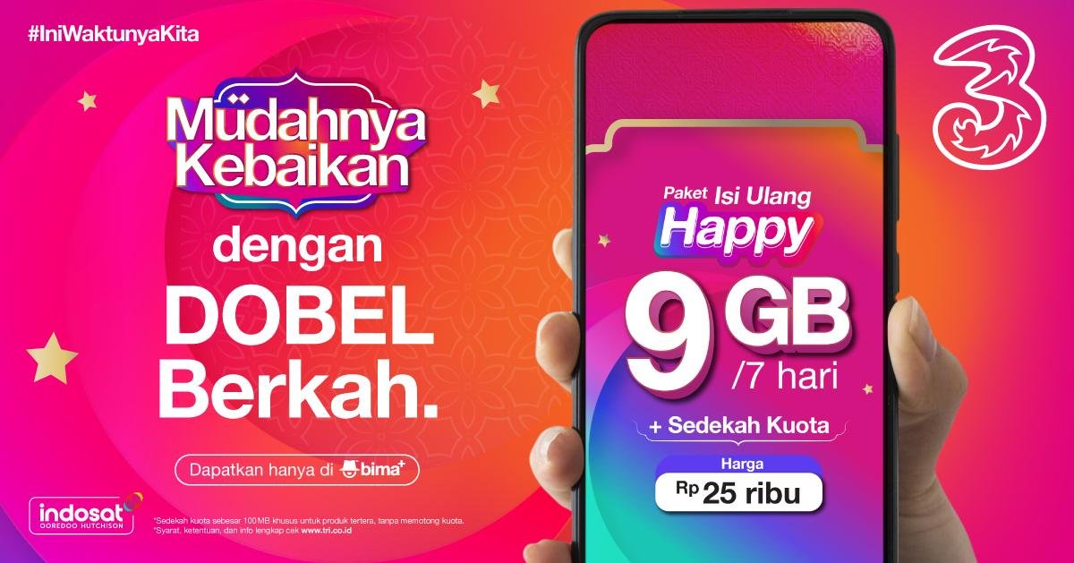 Kampanye ini mengajak para Gen Z untuk mendapatkan DOBEL Berkah di bulan Ramadan dengan memberikan sedekah kuota bagi yang membutuhkan. Pelanggan Tri dapat melakukan isi ulang Paket Happy 9GB yang berlaku untuk 7 hari atau Paket Isi Ulang Happy lainnya mulai dari 25.000.