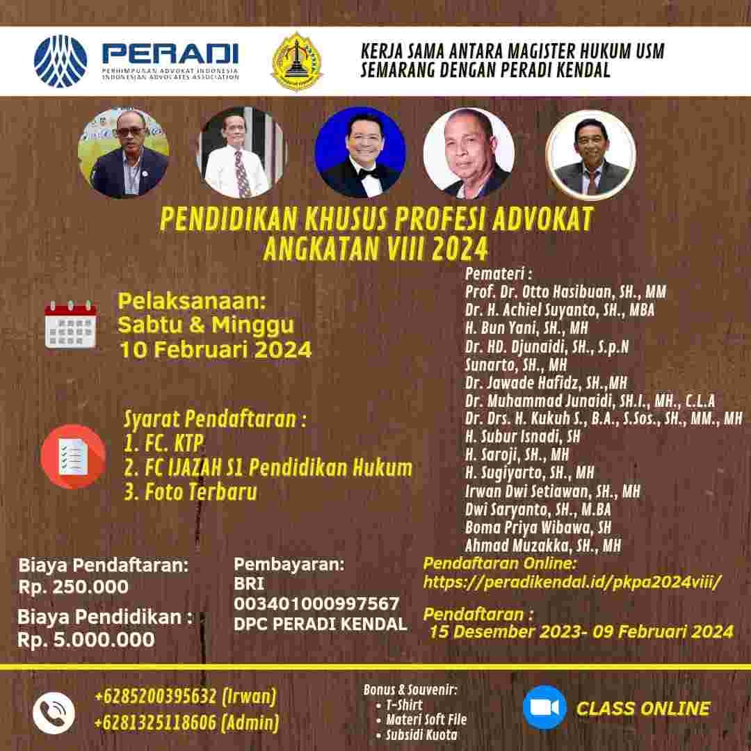 Ketua Panitia PKPA, Irwan Dwi Setiawan SH, MH berharap, para lulusan S1 Hukum segera mendaftar, karena pendaftaran ditutup 9 Februari 2024. Adapun para pengajar adalah para praktisi dan akademisi, di antaranya Prof Dr Otto Hasibuan, SH, MM, Dr HD Djunaidi, SH, SpN, Dr Djawade Hafidz, SH, MH, Dr Muhammad Junaidi, SHI, MH, Dr Drs H Kukuh SA, S Sos, SH, MM, MH, H Subur Isnadi, SH, Irwan Dwi Setiawan SH, MH, dan Boma Priya Wibawa SH. St