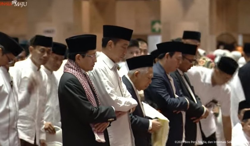 Jokowi tampak mengenakan mengenakan kemeja bewarna putih dan peci hitam. Presiden duduk di saf atau barisan depan bersama Ma’ruf Amin, Imam Besar Masjid Istiqlal Nasaruddin Umar, dan sejumlah menteri kabinet Indonesia Maju.