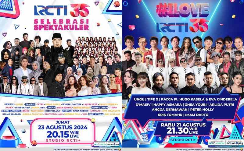 Jangan lewatkan Selebrasi Spektakuler RCTI 35 pada Jumat, 23 Agustus 2024 pukul 20.15 WIB dan Konser I Love RCTI pada Rabu, 21 Agustus 2024 pukul 21.30 WIB. Saksikan secara GRATIS di kanal digital 28 UHF untuk Jabodetabek dan Live Streaming di aplikasi RCTI+. Sb-st