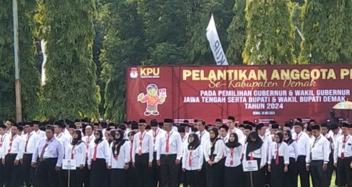 DEMAK (Jatengdaily.com)- Sebanyak 757 Panitia Pemungutan Suara (PPS) Pemilihan Kepala Daerah (Pilkada) Kabupaten Demak 2024 resmi dilantik, Minggu (26/05/2024). Pelantikan dipimpin Ketua KPU Kabupaten Demak Siti Ulfaati. Turut hadir acara yang berlangsung di halaman Setda Demak itu Sekda H Akhmad Sugiharto ST MT, berserta jajaran Forkompimda.
