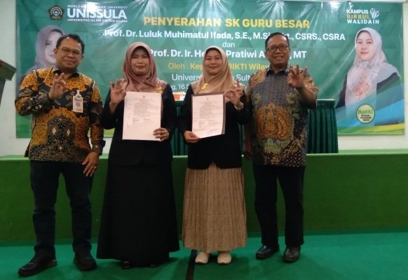 Bhimo Widyo Andoko mengatakan hal itu saat menyerahkan SK guru besar kepada Prof Dr Luluk Muhimatul Ifada SE MSi Ak CA dan Prof Dr Ir Henny Pratiwi Adi ST MT. SK diserahkan kepada Rektor Unissula Prof Dr Gunarto SH MH, yang selanjutnya rektor menyerahkannya kepada Prof Dr Luluk Muhimatul Ifada SE MSi Ak CA dan Prof Dr Ir Henny Pratiwi Adi ST MT.