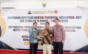 SK Pembukaan Prodi Manajemen ITB Semarang diserahkan oleh Kepala Lembaga Layanan Pendidikan Tinggi (LLDIKTI) Wilayah VI Jateng, Dr. Bhimo Widyo Andoko, S.H., M.H kepada Ketua Yayasan Pendidikan Tri Mulia Utama Semarang Dr. Iim Prasetya, S.E., M.Si.,Ak dan didampingi Rektor ITB Semarang Prof. Dr. Y Sutomo, MM pada Rabu (20/11/2024), bertempat di Kampus I, Jalan Jenderal Sudirman Semarang.