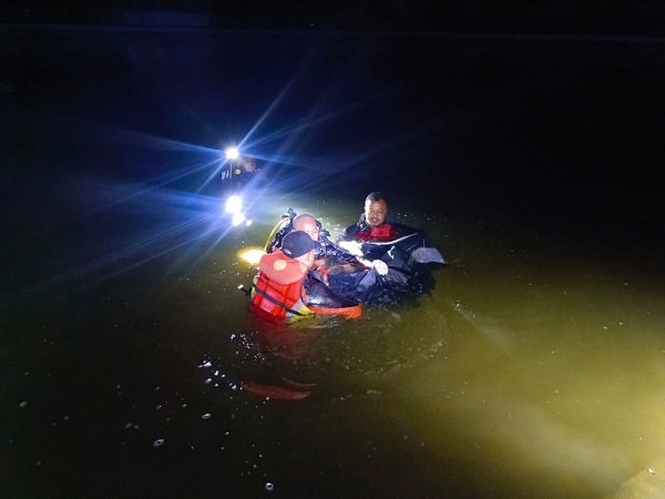 Meskipun pandangan terbatas dan minimnya penerangan, akhirnya setelah satu setengah jam pencarian, korban berhasil ditemukan dan dievakuasi dari dasar embung.