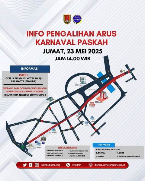 Bahkan, untuk memudahkan masyarakat yang ingin menyaksikan Karnaval Paskah ini, Dishub juga telah menyiapkan beberapa titik parkir. Bagi pengguna kendaraan roda dua maupun roda empat, tempat parkir yang disediakan di Gedung parkir Balai Kota Semarang, DP Mall, Udinus, SMU Negeri 3, serta Museum Mandala Bakti.