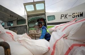 Petugas memuat bahan semai Natrium Klorida (NaCl) ke dalam lambung pesawat dalam rangkaian proses Operasi Modifikasi Cuaca (OMC) Jawa Tengah di Apron Bandara Ahmad Yani, Semarang, Jawa Tengah. Foto: BNPB