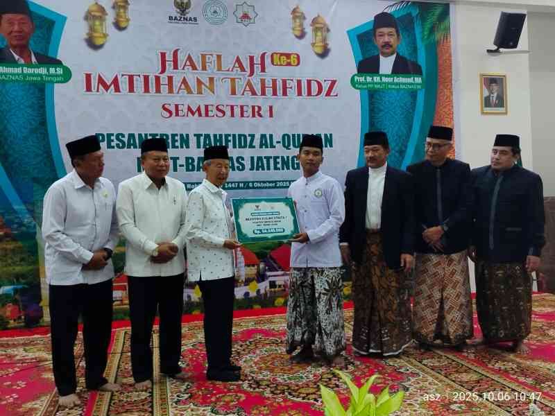 Puluhan santri bersarung rapi duduk berbaris di depan para tamu undangan. Mereka hadir dalam Haflah ke-6 Imtihan Tahfidz Semester I Pondok Pesantren Tahfidz Al-Qur’an MAJT–Baznas, sebuah tradisi rutin untuk menandai capaian hafalan para penghafal Al-Qur’an.