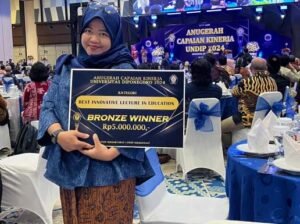 SEMARANG (Jatengdaily.com)- Dosen Program Studi (Prodi) Teknik Infrastruktur Sipil dan Perancangan Arsitektur Sekolah Vokasi Universitas Diponegoro (SV Undip) Riza Susanti ST MT pada 24 Januari 2025 menerima penghargaan dari Undip sebagai “Bronze Winner Best Innovative Lecturer in Education” atau meraih penghargaan perunggu dosen yang berprestasi dan inovatif di bidang pengajaran dalam ajang penghargaan Anugrah Capaian Kinerja Undip Tahun 2024.