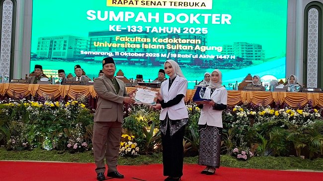 Oleh karena itu, FK Unissula dituntut untuk meluluskan dokter-dokter baru yang hebat. ”Kami yakin FK Unissula bisa mencetak dokter-dokter hebat. Sampai saat ini saja, kami telah meluluskan sebanyak 6.350 dokter yang tersebar di seluruh Nusantara. Oleh karena itu, saya berharap 43 dokter baru yang hari ini diambil sumpahnya, bisa mengikuti jejak alumni terdahulu, bekerja dengan baik,” jelas Dekan FK Unissula, Sabtu (11/10/2025), dalam acara pengambilan sumpah dokter ke-133 tahun 2025, dalam acara rapat senat terbuka, di kampus FK Unissula, Jalan Kaligawe Semarang.