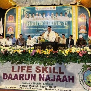 SEMARANG (Jatengdaily.com)  — Suasana penuh kehormatan dan kehangatan menyelimuti Pondok Pesantren Life Skill Daarun Najaah pada Sabtu (15/11/2025). Pada hari itu, ratusan jamaah, ulama, umara, alumni, dan masyarakat sekitar berkumpul dalam Puncak Haul dan Haflah ke-13, menandai berakhirnya rangkaian kegiatan yang sejak awal bulan digelar dengan penuh semangat dan kebersamaan.