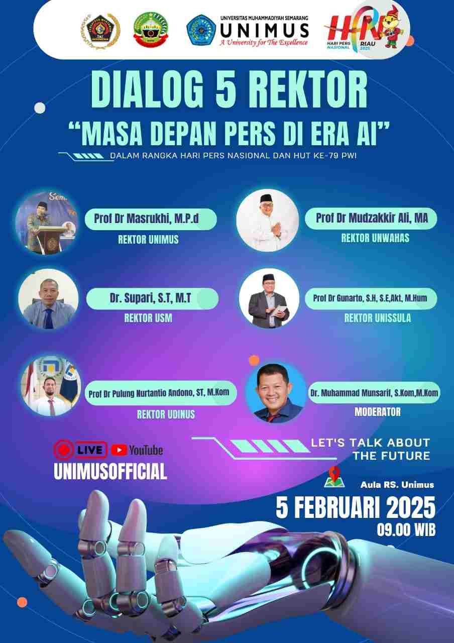 SEMARANG (Jatengdaily.com) – Dialog Rektor yang mengusung tajuk ”Masa Depan Pers di Era AI” dalam memperingati Hari Pers Nasional (HPN) 2025 Tingkat Jateng akan digelar di Aula RS Universitas Muhammadiyah Semarang (Unimus), Rabu besok 5 Februari 2025 mulai pukul 09.00 WIB.