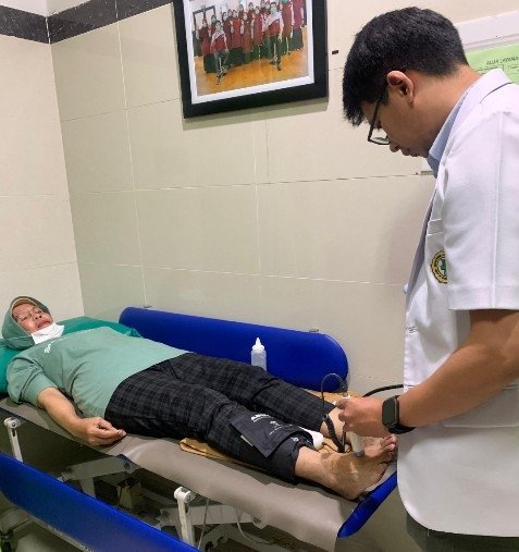 Kegiatan ini turut melibatkan mahasiswa calon dokter spesialis penyakit dalam (PPDS) serta mahasiswa koas FK Unissula. Mereka berperan langsung dalam pemeriksaan kesehatan para peserta, khususnya melalui Ankle Brachial Index (ABI), sebuah pemeriksaan penting untuk mendeteksi gangguan aliran darah pada tungkai bawah yang dapat meningkatkan risiko terjadinya ulkus kaki diabetes.