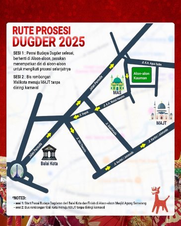 Secara detail, rute Kirab Budaya Dugderan 2025 ini bermula dari Balai Kota melewati Jalan Pemuda menuju Alun-Alun Kauman, selanjutnya arak-arakan menuju MAJT.