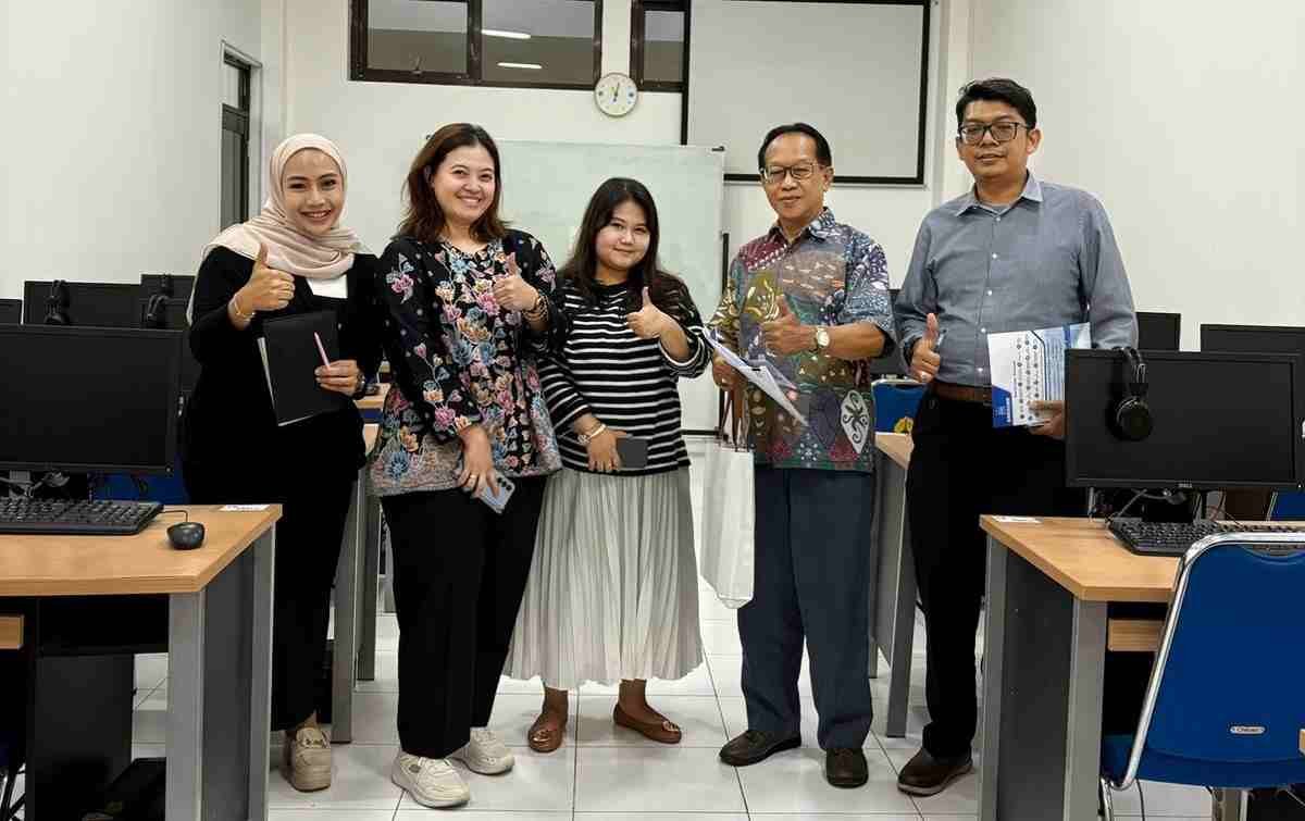 SHM-USM LCC – HR Manager PT Shan Hai Map Sheila Dwi Perina dan Supervisor HR Internal Mahda Pramesti (2-3 dari kiri) bersama Adi Ekopriyono (2 dari kanan), Devy Angga Gunantar (kanan) dan Hermin Anggraini (kiri), setelah meninjau laboratorium bahasa LCC. Foto:dok