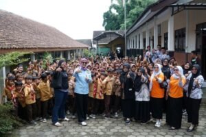 Anggota DPD RI Denty Eka Widi Pratiwi (berkacamata) berfoto bersama para siswa di Desa Kemloko dalam rangkaian kegiatan bakti sosialnya. Foto: dok