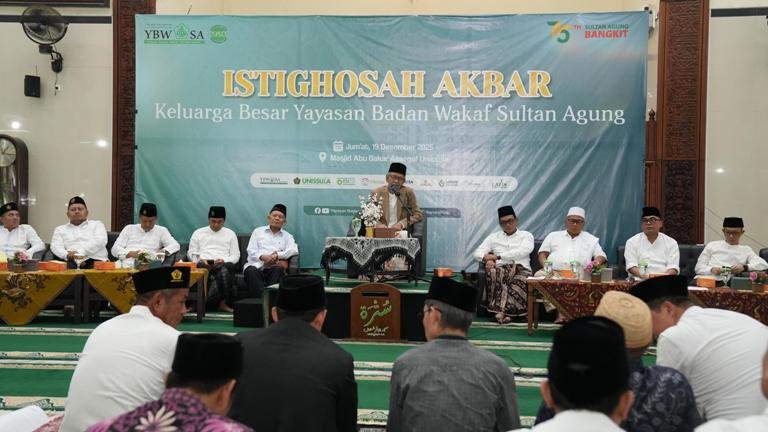 SEMARANG (Jatengdaily.com)- Di tengah hiruk pikuk kehidupan dunia, keluarga besar Yayasan Badan Wakaf Sultan Agung (YBWSA) menggelar Istighosah Kubro sebagai momentum refleksi diri, penguatan iman, dan ruqyah spiritual. Kegiatan ini dilaksanakan pada Jumat, 19 Desember 2025, bertempat di Masjid Abu Bakar Assegaf, dan diikuti oleh jajaran pengurus serta pegawai di lingkungan YBWSA.