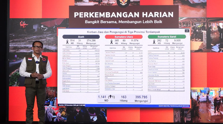 “Per hari ini bertambah satu orang meninggal dunia, sehingga total korban jiwa menjadi 1.141 orang. Kami terus menyampaikan doa dan simpati yang mendalam kepada keluarga korban,” ujar Abdul Muhari dalam Konferensi Pers Update Penanganan Bencana Banjir dan Longsor, Selasa (30/12/2025) dilansir dari laman Infopublik.