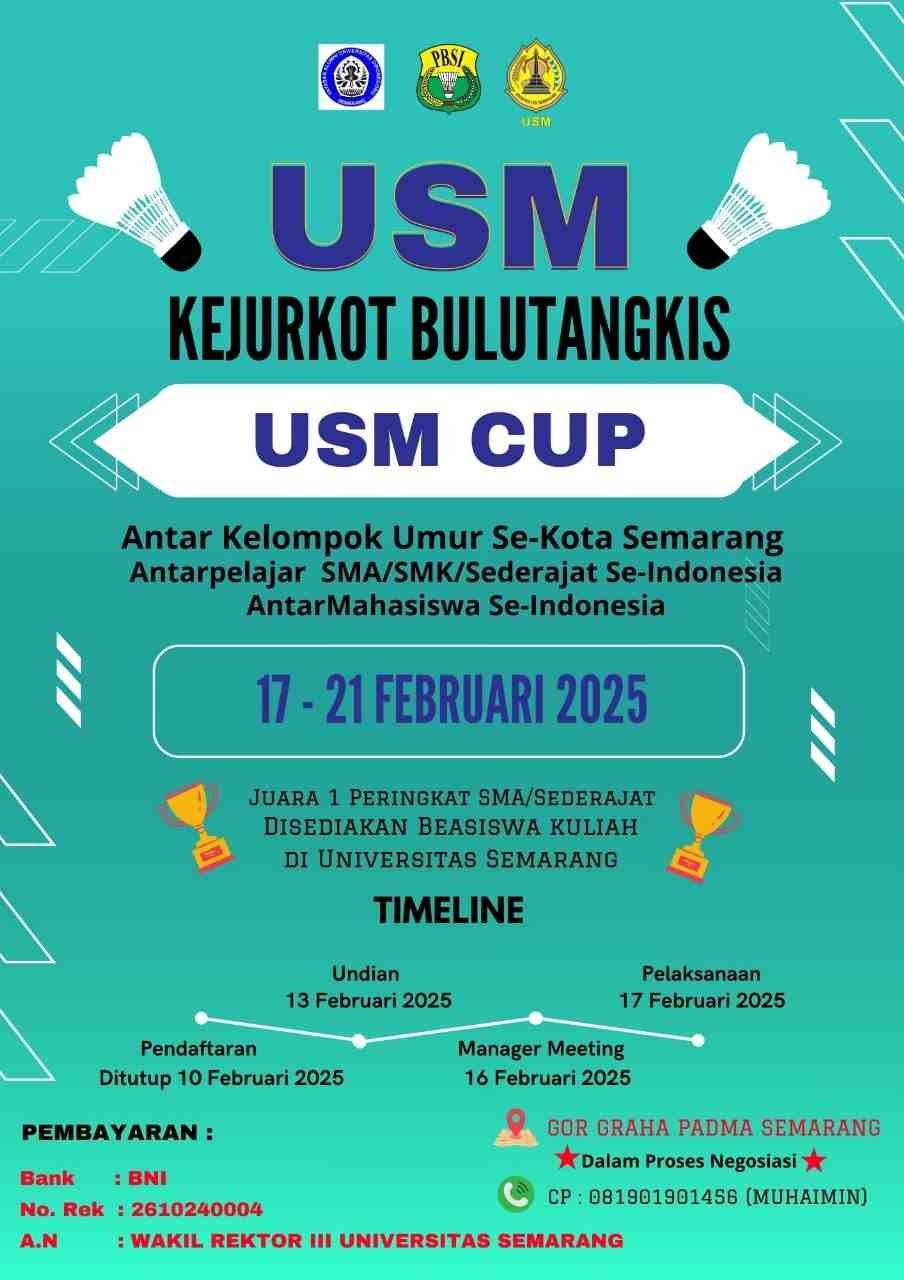 SEMARANG (Jatengdaily.com) – Universitas Semarang (USM) menggandeng Pengkot PBSI Semarang menggelar Kejurkot Bulu Tangkis USM Cup 2025 di GOR Graha Padma Semarang pada 17 – 21 Februari 2025.