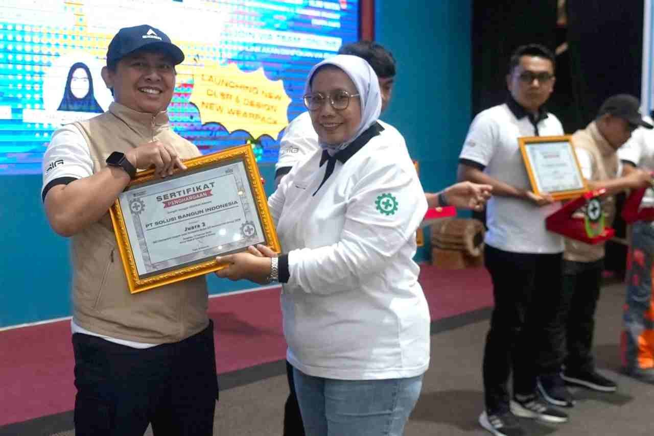 Direktur Operasi SIG, Reni Wulandari (tengah) menyerahkan piagam penghargaan kompetisi SIG K3 Champions League  kepada tim K3 PT Solusi Bangun Indonesia Tbk (SBI) pada acara penutupan Bulan K3 Nasional 2026 SIG Group di PT Semen Tonasa, Pangkep, Sulawesi Selatan, pada Jumat (13/2/2026).Foto:dok