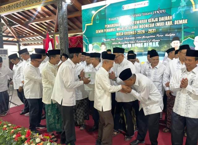 DEMAK (Jatengdaily.com) – Ketua Umum Majelis Ulama Indonesia (MUI) Jawa Tengah Dr.KH Ahmad Darodji MSi mengukuhkan Pengurus MUI Kabupaten Demak masa Khidmah 2026-2031. Upacara pengukuhan disaksikan Bupati Demak dr Hj Eisti’anah SE , Wakil Bupati KH Muhammad Badruddin Ma’shum MPd, Sekda Akhmad Sugiharto ST MT, KH Muhammad Asyiq dan para pengurus MUI Kecamatan se-Kabupaten Demak di Pendapa Kabupaten, Sabtu (25/4).