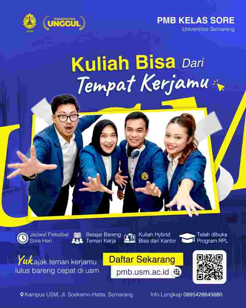 ”Keunggulan Kuliah di USM antara lain, waktu kuliah lebih fleksibel, cocok untuk yang sambil bekerja, kesempatan lulus lebih cepat (3,5 tahun), dan lingkungan akademik yang berkualitas. Pendaftaran melalui pmb.usm.ac.id. USM juga membuka jalur RPL, lulus dalam 1,5 Tahun,” ungkapnya.