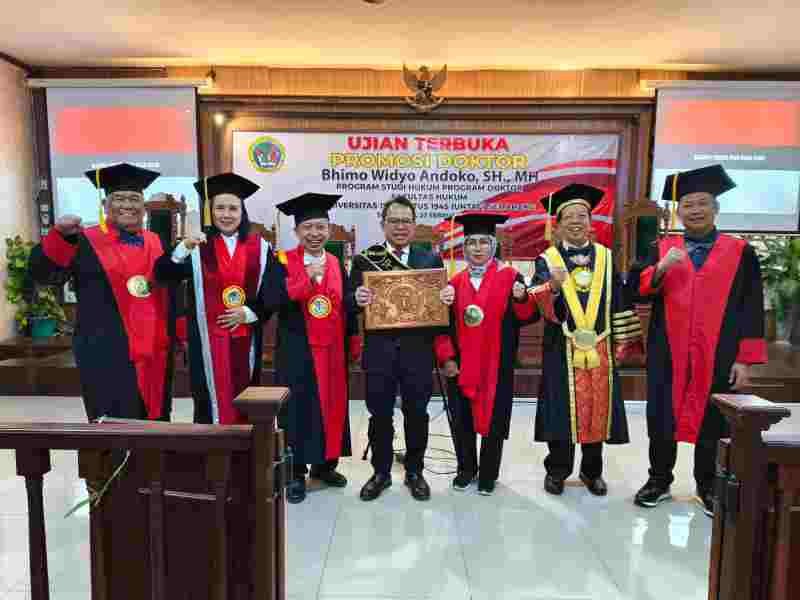 Bhimo Widyo Andoko, mantan Kepala LLDIKTI Wilayah VI Jawa Tengah, resmi meraih gelar doktor setelah berhasil mempertahankan disertasinya dalam ujian terbuka di Program Studi Hukum Program Doktor Fakultas Hukum Universitas 17 Agustus 1945 Semarang.Foto:dok
