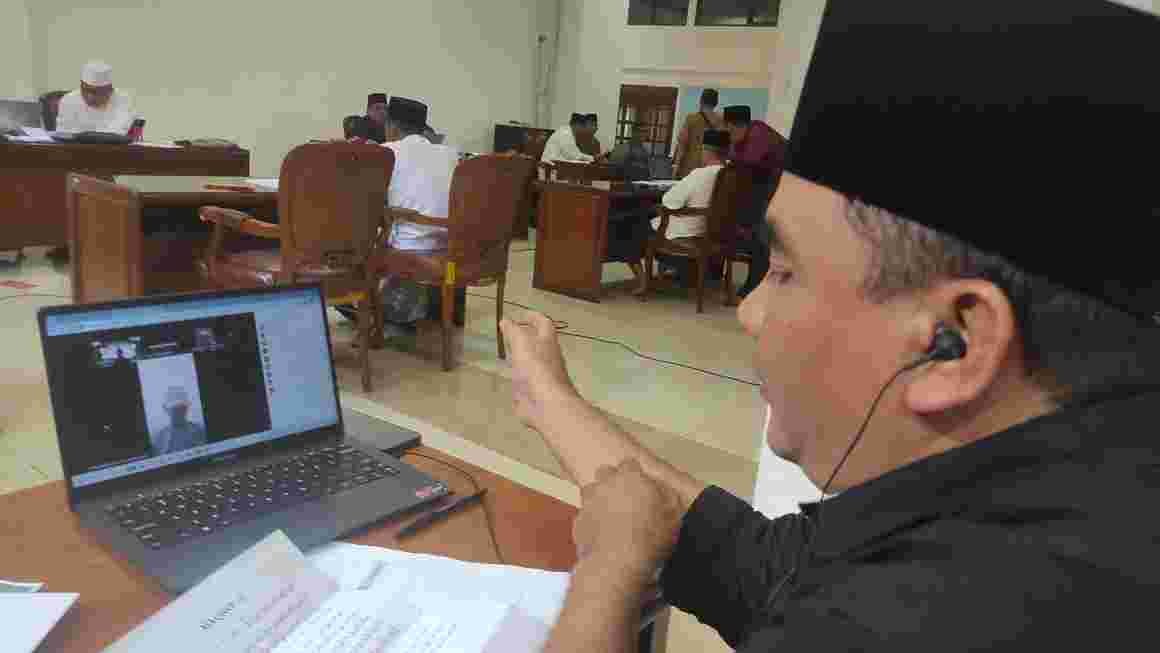 Dewan juri MHQ menguji peserta pada babak penyisihan MHQ melalui zoom. Peserta dengan mata tertutup menjawab pertanyaan hakim. Foto:dok